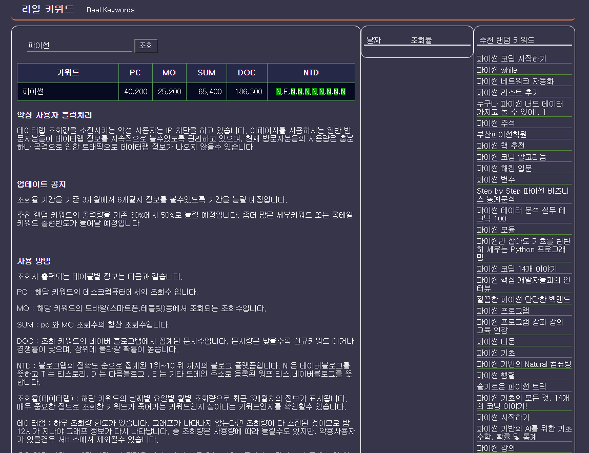 파이썬을 조회 해보면 추천 랜덤 키워드, PC,Mobile 등 조회수 표시 를 해준다.