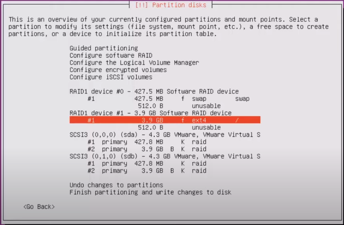 최종 화면, 지금은 Swap 와 / 공간 만 만들기 때문에 2개의 raid 파티션으로 나눴지만 더 만들어서 raid를 묶을 수 있다.
