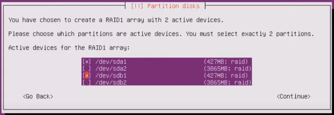 Raid1로 묶을 때 는 같은 용량의 파티션 선택 해준다.